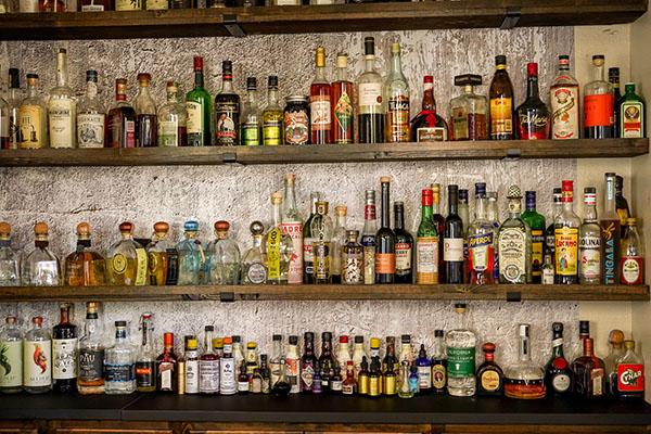 bottles of liquor on a shelf with fashioned glass by gabriella-clare-marino