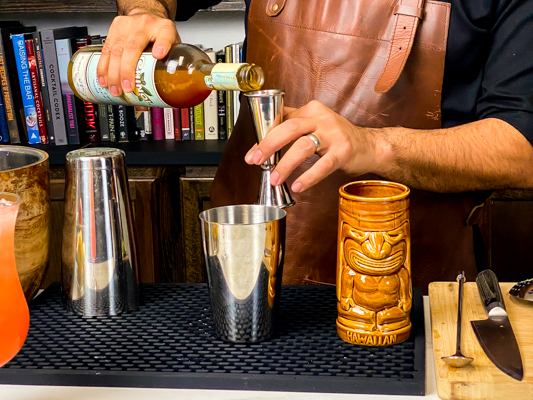 2. Pour your thinnest ingredients first. If you pour a purée first, for example, and there is some residue inside the jigger… you just cannot get a precise pour on the next ingredient you add. I save the thick ingredients for the very last measure.