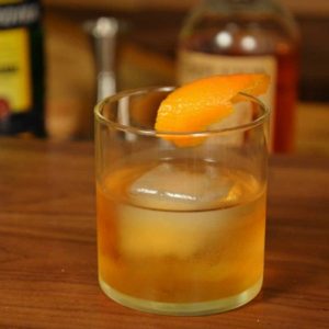 - Strain into a bucket glass, and serve with a large piece of ice and citrus rind.