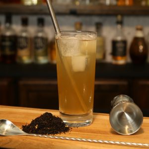 - Add 4 oz of verjus, honey, and peach tea infusion to a Collins glass.